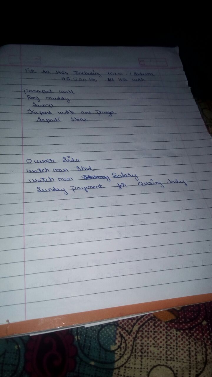 Everyone in the forum are talking about per sft labor cost and negotiations . The most importing things to include in any agreement ( there is no formal agreement in labor contract ) is the items included and more importantly excluded items. Excluded items are never given by any mason since they are the grey areas and they don't wont to loose on those small money ( example plumbing chambers, bund walls, external ramp, water proofing and many more ).