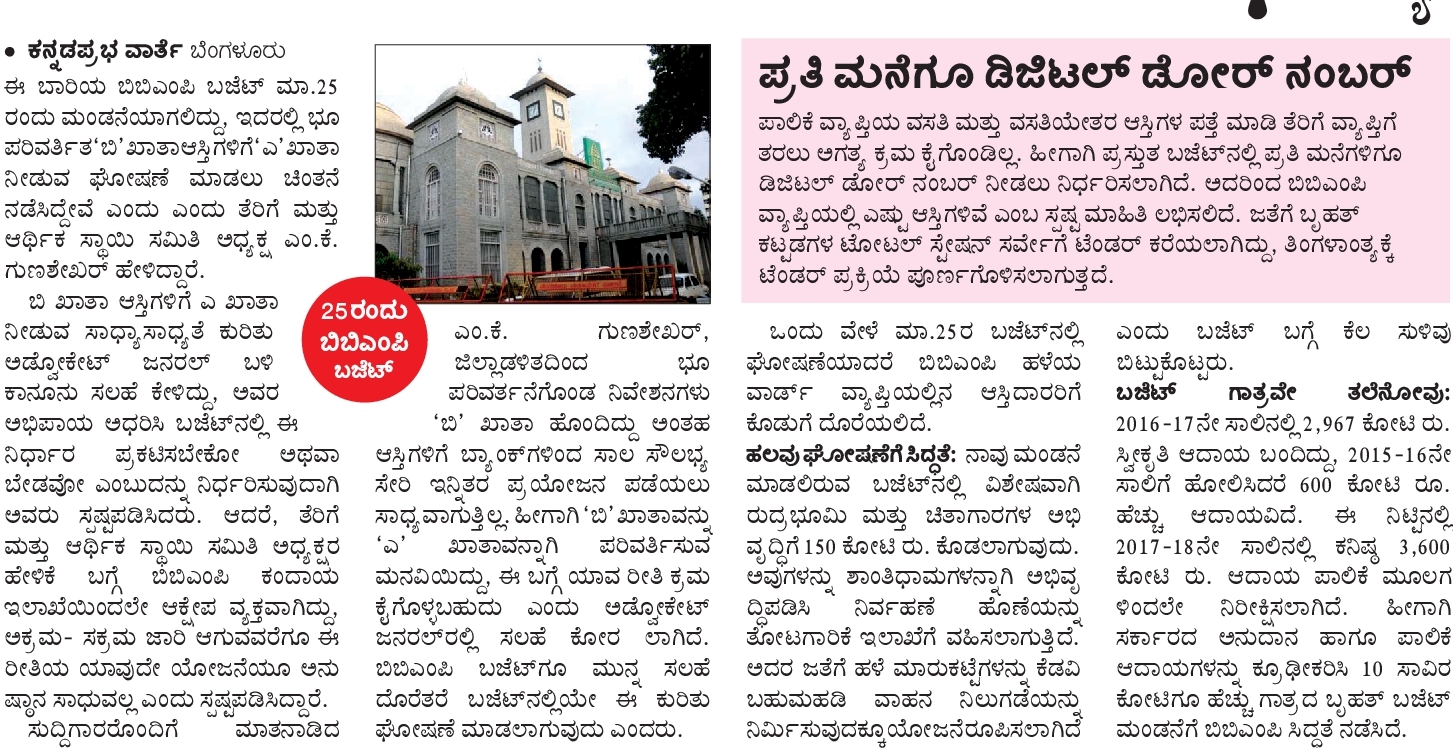 In order to mobilize revenue and to bring non-taxed properties under the tax, BBMP is planning to issue A-Khata for all the B-Khata Properties based on the legal opinion.