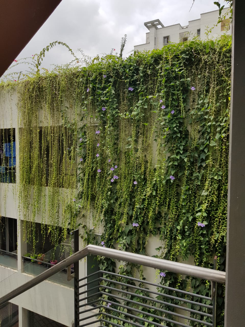 Now that building in all done and you don't have soil area at the ground level to grow creepers . You can cover the pipes with basic Ms ribbed grill and then grow curtain creepers from terrace in large size pot. Curtain creepers will add amazing drama to the whole elevation.
