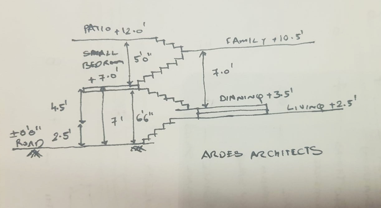 3. The ground floor ceiling have different height for small bedroom. The small bedroom is at a split floor which starts from a height of around 5 feet from Living room. Living room is almost at a height of 2.5 feet from Parking. So overall height has a difference of 7.5 feet between small bedroom floor and parking. If i want to increase the overall parking height , then i have to increase the Living room height.