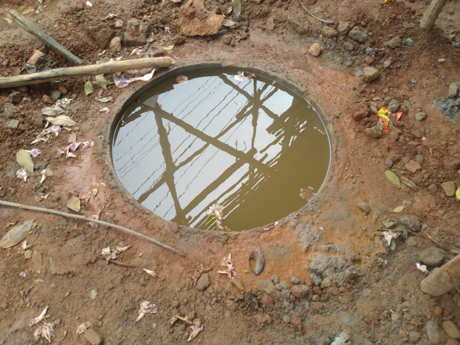 After the Water proofing plastering has been done for the greywater collection tank made up of 4 ft Cement Rings, currently its filled up with water to the full capacity and under observation for any kind of water leakage. Already 4 days completed. So far no change in the water level. It will be monitored for another 8-10 days. If no water drain out happens, then we can conclude the water proofing is perfect and the next work of plumbing provisions for the incoming and outgoing water Connections will be given & it will be closed with the heavy duty cement Cap, as this place is used for the 4 wheeler parking.