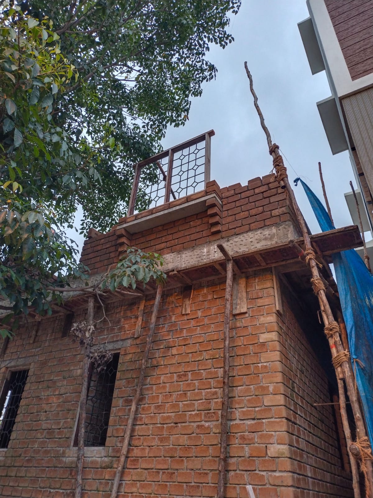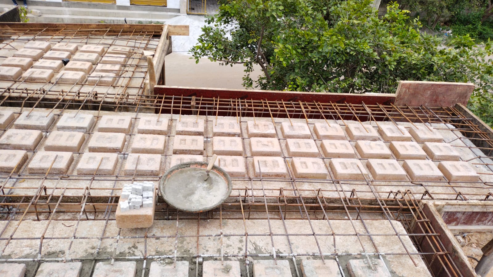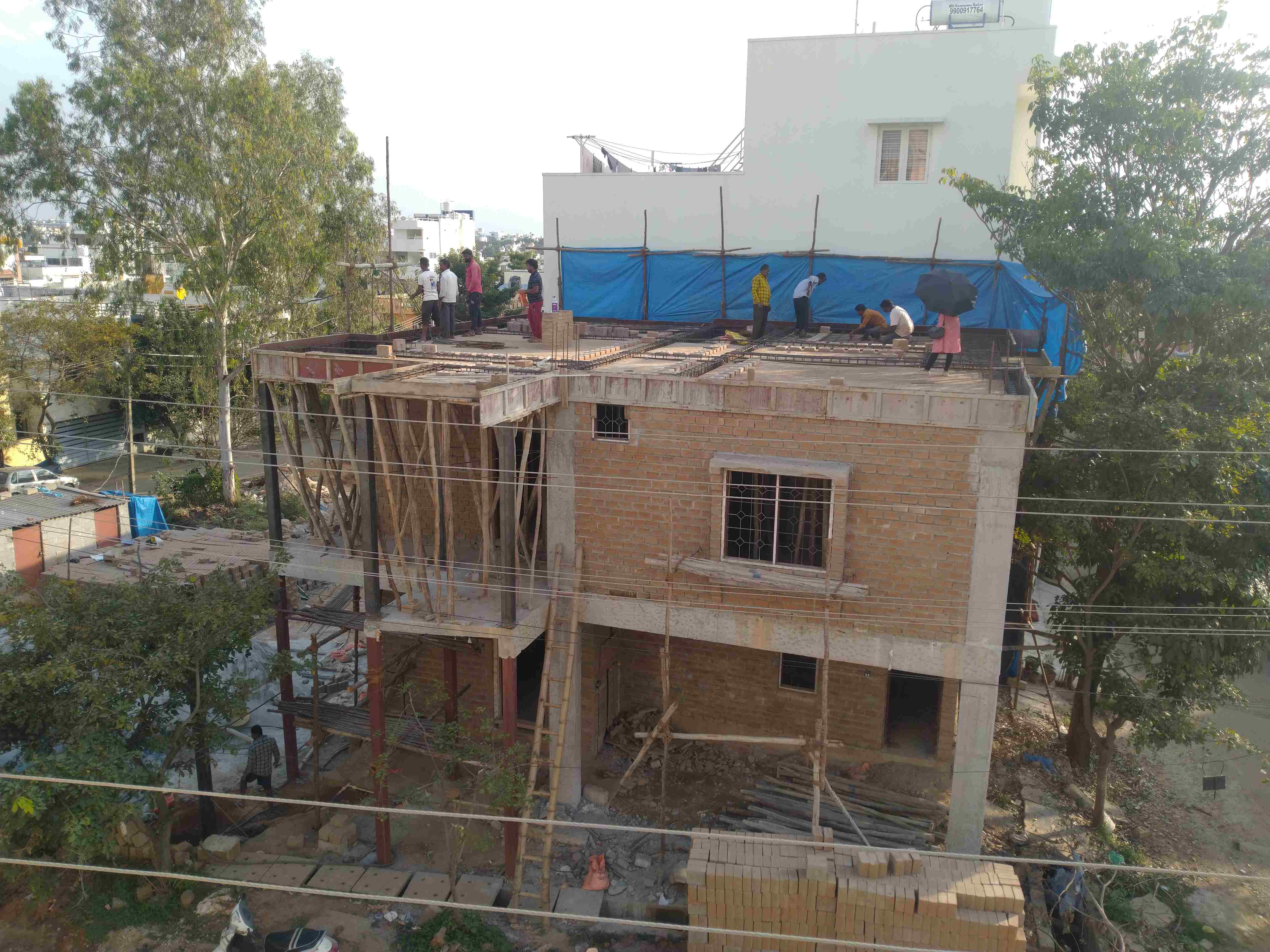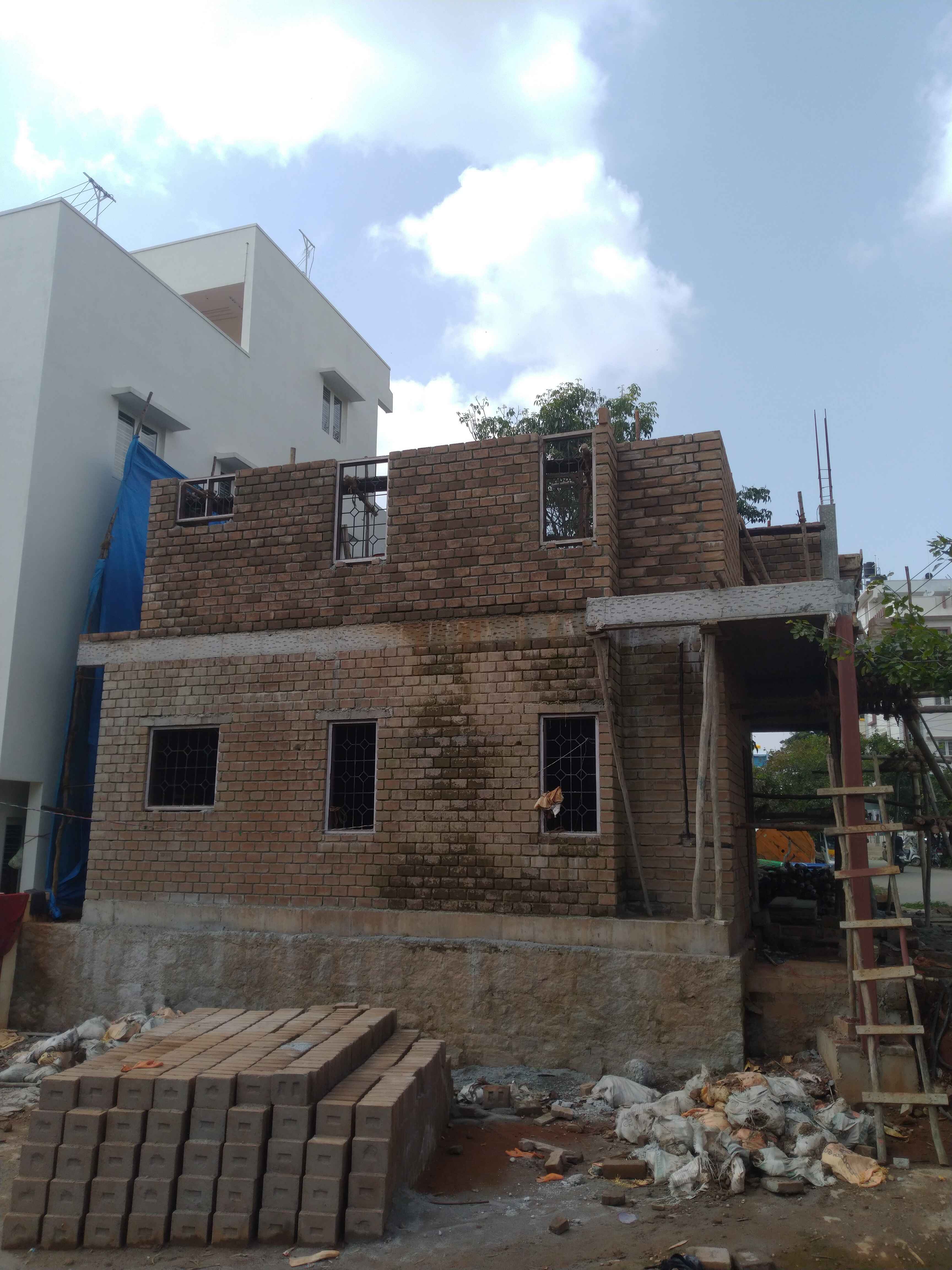 First Floor wall construction completed with a height of 10+ feet and Pre-moulding activities started now by providing the Cantering Support, customised 2.5" CSEB Brick used Filler Slab rooting activities similar to the Ground Floor Moulding.
