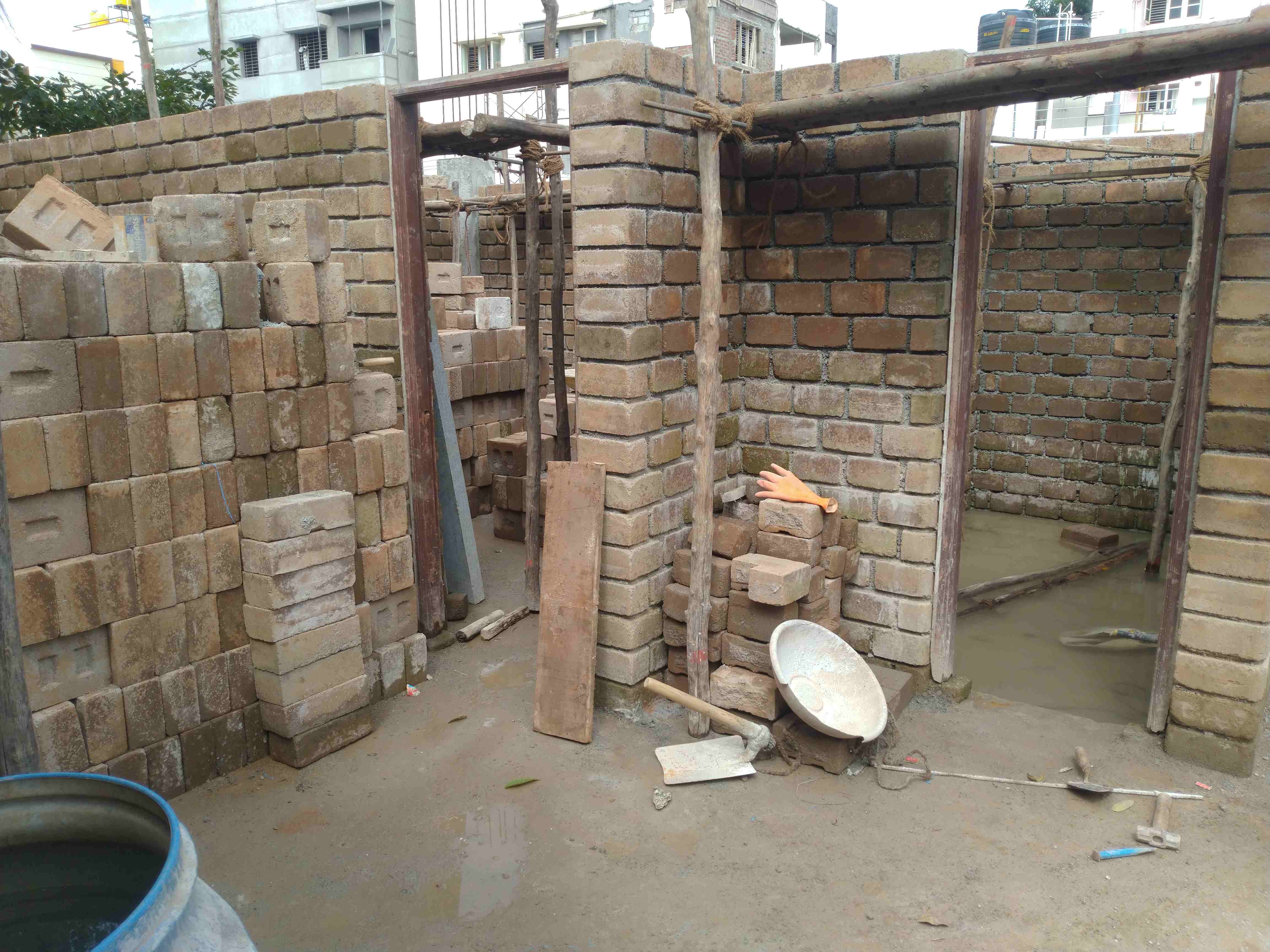 First floor construction has reached up to the lintel level and expected to be ready for roofing preparation by next week. First picture shows you, how the sadarahalli Stone slab of 6 x 2 size is placed to make the Bay Window from inside.