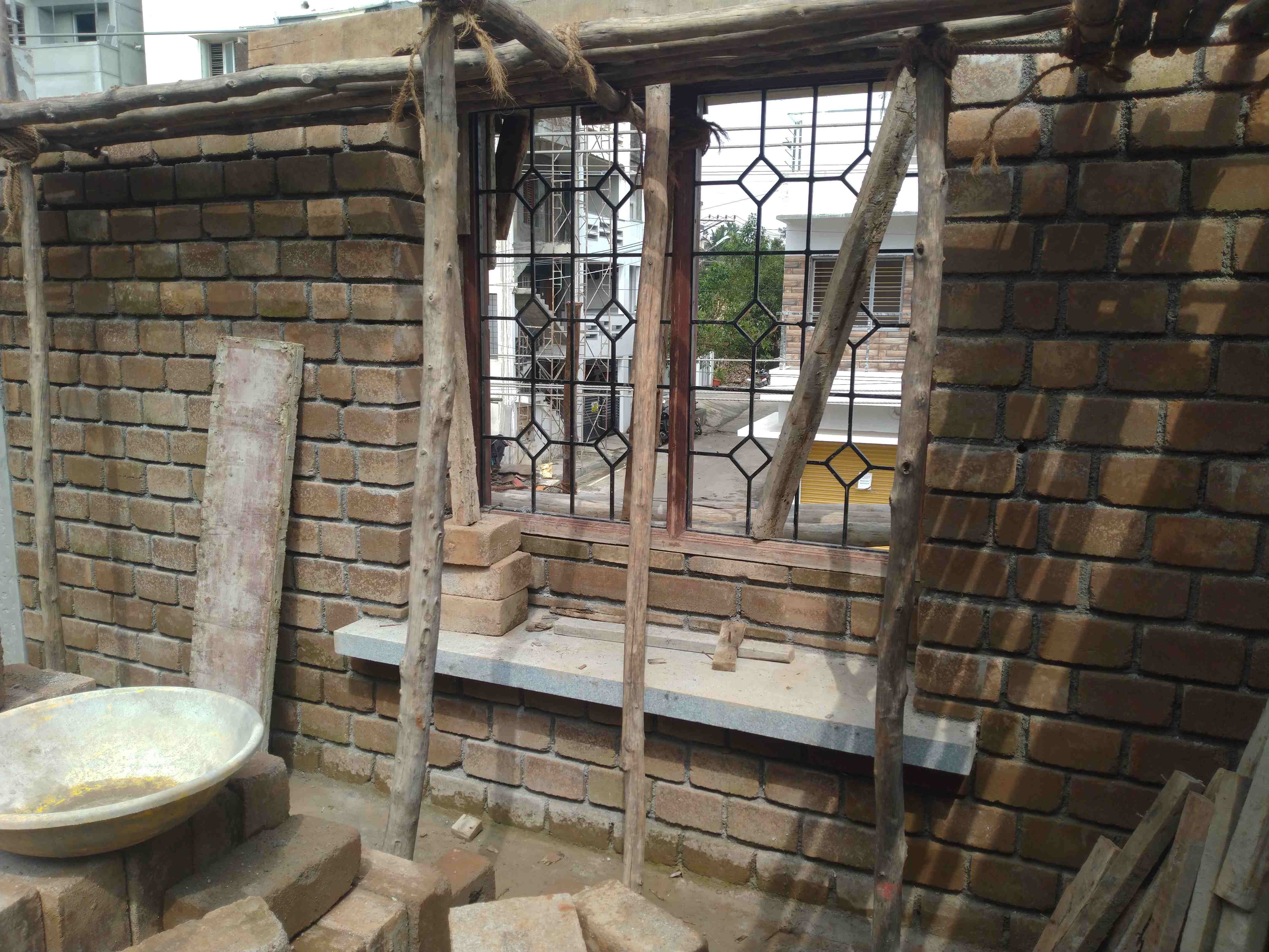 Moving forward, building the Bay windows in the Bed room is going on. providing Bay window eliminates the need for using chairs or Furnitures inside Bedrooms. We are using 6 X 2 ft Sadarahalli Stone Slab as the base for making the Bay Window. 3" is the thickness of these slabs. Excluding Max 6" occupied by the Window Frame, rest min 1.5 ft width is available for sitting usage. Advantage of going for the Stone Slab is, it doesn't need laying another layer of Granite or marble tiles over it & also it doesn't need painting outside. Only constraint is normally 2.0 ft width is the commonly available width in Stone Slabs. Transporting and supporting them is a big task, as they're very heavier. If we need more wider, it will be a custom size and to be ordered and procured exclusively, which may attract premium charge. More over, it will weigh much more heavy and transporting to higher levels and giving support in the construction phase is also a major challenge.