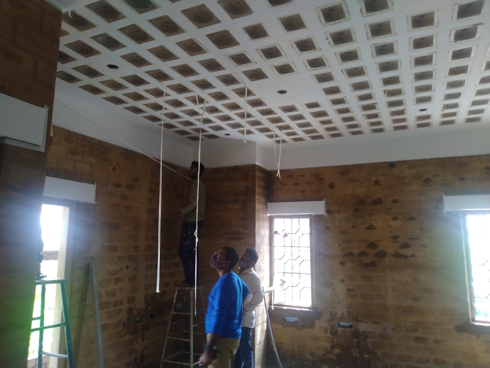 now Ceiling putty & painting work is going. As we have used the CSEB half thickness(2.5" inches) Bricks while making the Filler Slab RCC Molding, we can see a Semi "SPHERE" kind of Shape on the Ceiling. Similarly, many options available for Filler Slab molding like Clay Pots, Mangalore Tiles, Many Different Shaped Clay Tiles, .....etc.
