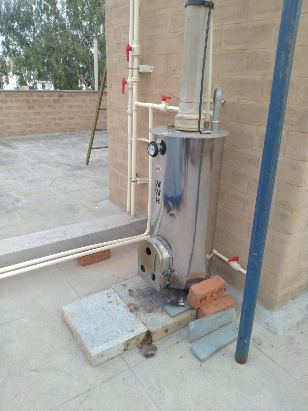 This weekend installed the new Bio-Mass Hot water Boiler or Wood-Fired Boiler, also popularly known as Gujarat Boiler for a conventional way of heating the water for bathing. Its a 60 Ltr Capacity suitable for 4-5 members need. This will be used as an alternate option to heat the water either on weekends or during consecutive cloudy/raining days, where Solar water heater will not be able to generate hot water. It can maintain Hot water between 2 to 6 hours based on the season.