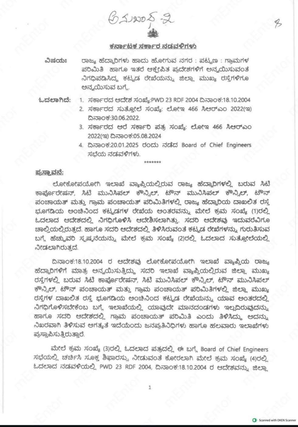 ​ಜಿಲ್ಲಾ ಮುಖ್ಯ ರಸ್ತೆಗಳ ಪಕ್ಕದಲ್ಲಿ ಮನೆ, ಅಂಗಡಿ, ಯಾವುದೇ ವಾಣಿಜ್ಯ ಕಟ್ಟಡ ಕಟ್ಟುವ ಯೋಚನೆಯಲ್ಲಿದ್ದರೆ, ಕರ್ನಾಟಕ ಸರ್ಕಾರದ ಲೋಕೋಪಯೋಗಿ ಇಲಾಖೆ ಹೊರಡಿಸಿರುವ ಈ ಆದೇಶವನ್ನು ಗಮನಿಸುವುದು ಅತ್ಯಗತ್ಯ. ​ಇದುವರೆಗೆ ಕೇವಲ 'ರಾಜ್ಯ ಹೆದ್ದಾರಿ'ಗಳಿಗೆ ಮಾತ್ರ ಅನ್ವಯಿಸುತ್ತಿದ್ದ "ಕಟ್ಟಡ ರೇಖೆ" ಅಂತರದ ನಿಯಮವನ್ನು, ಇದೀಗ ಜಿಲ್ಲಾ ಮುಖ್ಯ ರಸ್ತೆಗಳಿಗೂ ಅನ್ವಯವಾಗುವಂತೆ ಸರ್ಕಾರವು ಫೆಬ್ರವರಿ 17, 2025 ರಂದು ಹೊಸ ಆದೇಶವನ್ನು ಹೊರಡಿಸಿದೆ.
