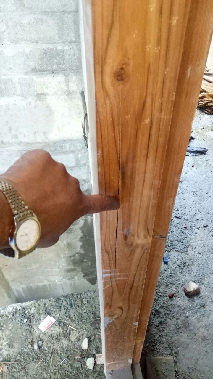 When we visited the construction site today, we noticed a couple of vascals with cracks.( Contractor has used teak for main door and white sal for internal door frames).