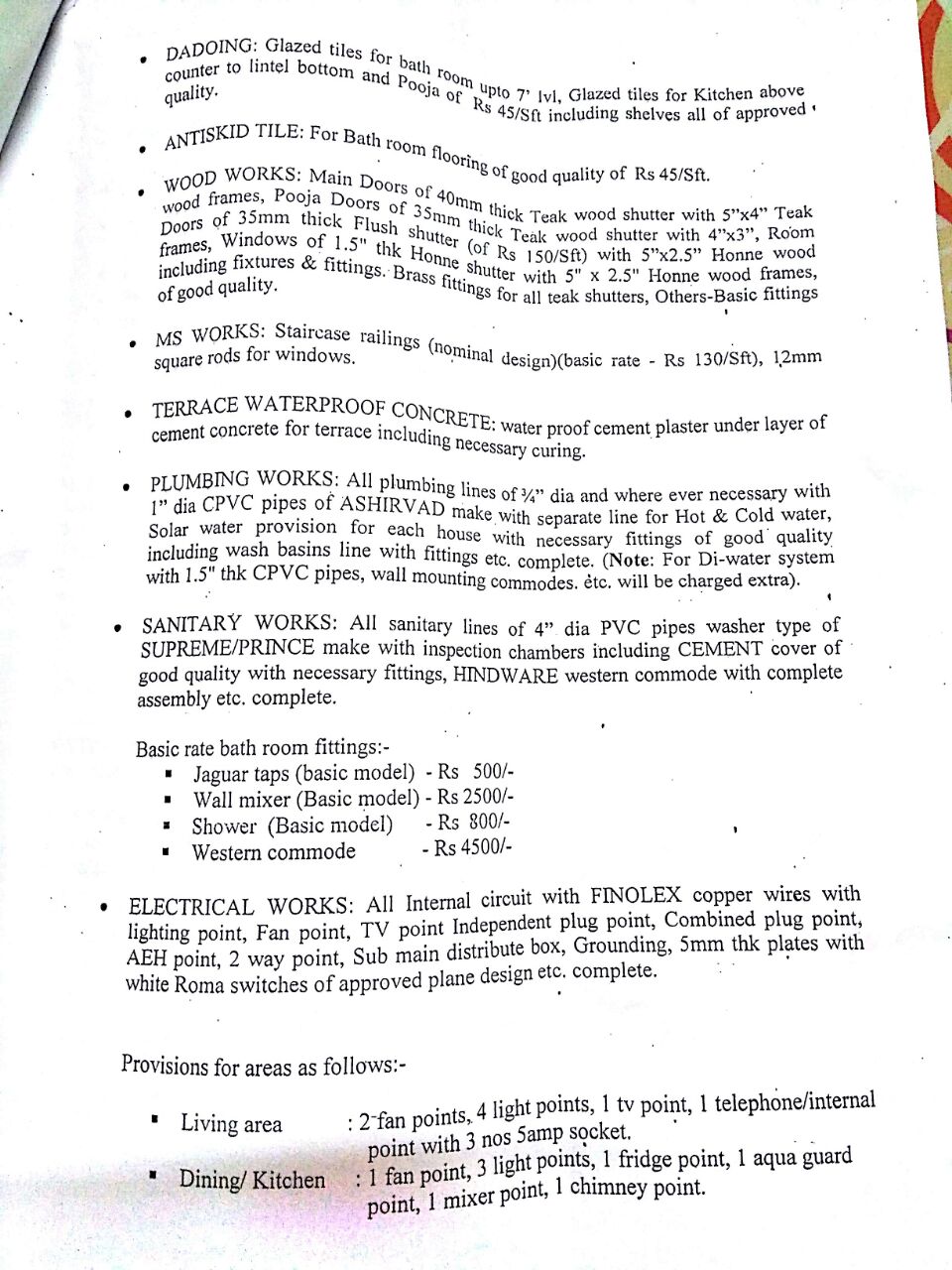 We have finalised the plan for the house G+3. I have received material contract quote from the contractor. Pooja room , sky light, steps flooring, wood flooring for two rooms in 2nd floor and living area will be executed by another person . Members please review the quote and advise.