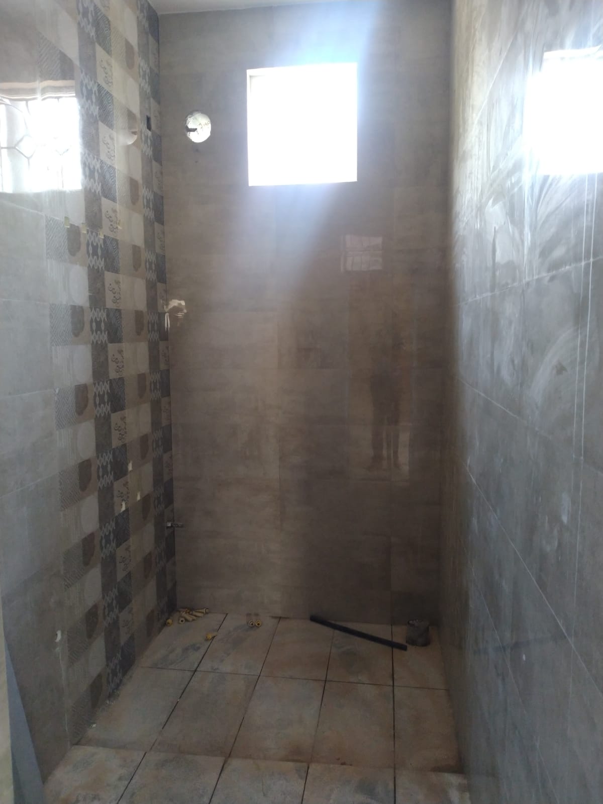 Bathroom Tiles laying work completed. used 2x1 ft tile size and did tiling for the full wall till the roof level, rather than the standard just 5 or 7 ft height, as the cost of painting and tiling comes to the same. Meanwhile maintaining cleanliness of Tiles is easier than the plastered & painted walls especially where the space is always watery, moisture and scaling is a regular issues. For the bathroom flooring we used the sadarahalli stone of 2X1 ft which is anti-skid and durable and looks more of natural.