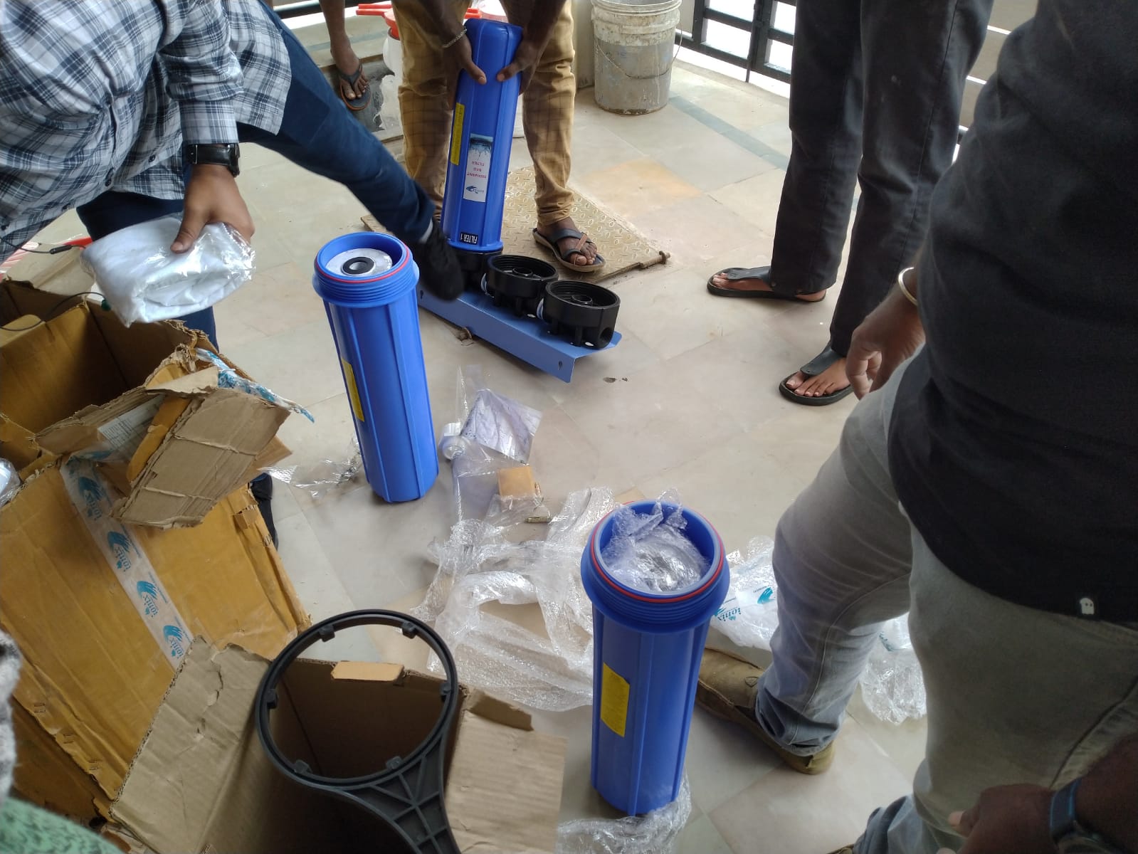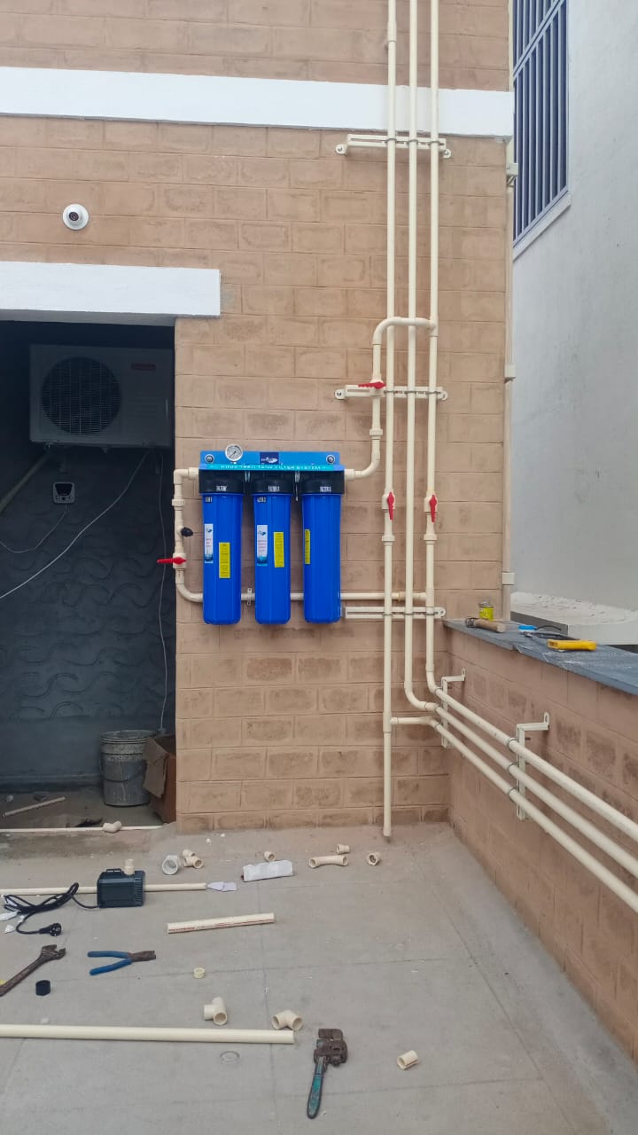 currently Grey water recycling filters got installed, which is a 3 stage filtering processing. First phase removed the suspended particles from the water, second phase removes the micro dust particles and third one is carbon filtering which eliminates the color and odor of the water. Apart from this there will be small pumps used to recycle the water within the grey water Sump as well as at the Over Head Tank