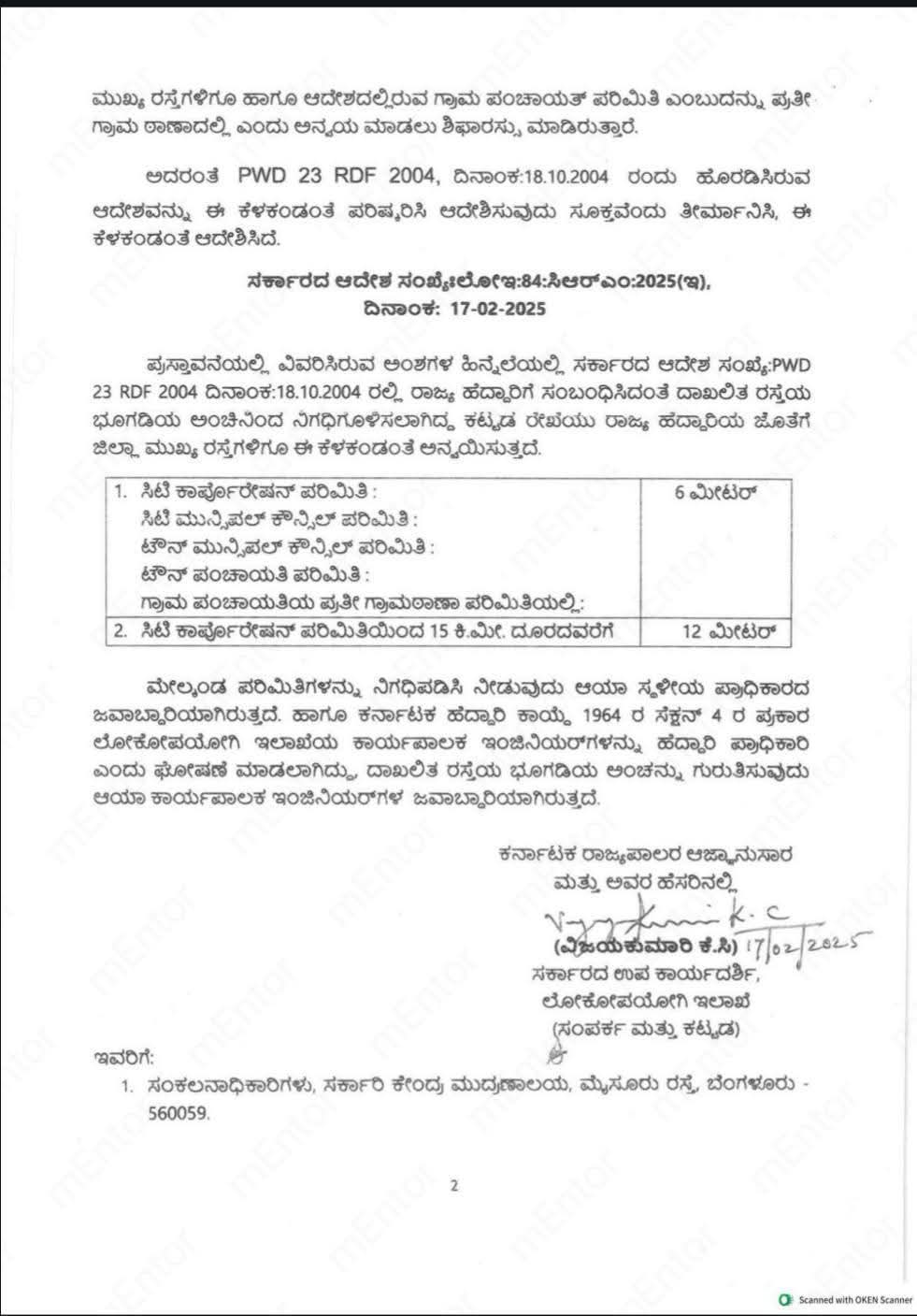 ​ಜಿಲ್ಲಾ ಮುಖ್ಯ ರಸ್ತೆಗಳ ಪಕ್ಕದಲ್ಲಿ ಮನೆ, ಅಂಗಡಿ, ಯಾವುದೇ ವಾಣಿಜ್ಯ ಕಟ್ಟಡ ಕಟ್ಟುವ ಯೋಚನೆಯಲ್ಲಿದ್ದರೆ, ಕರ್ನಾಟಕ ಸರ್ಕಾರದ ಲೋಕೋಪಯೋಗಿ ಇಲಾಖೆ ಹೊರಡಿಸಿರುವ ಈ ಆದೇಶವನ್ನು ಗಮನಿಸುವುದು ಅತ್ಯಗತ್ಯ. ​ಇದುವರೆಗೆ ಕೇವಲ 'ರಾಜ್ಯ ಹೆದ್ದಾರಿ'ಗಳಿಗೆ ಮಾತ್ರ ಅನ್ವಯಿಸುತ್ತಿದ್ದ "ಕಟ್ಟಡ ರೇಖೆ" ಅಂತರದ ನಿಯಮವನ್ನು, ಇದೀಗ ಜಿಲ್ಲಾ ಮುಖ್ಯ ರಸ್ತೆಗಳಿಗೂ ಅನ್ವಯವಾಗುವಂತೆ ಸರ್ಕಾರವು ಫೆಬ್ರವರಿ 17, 2025 ರಂದು ಹೊಸ ಆದೇಶವನ್ನು ಹೊರಡಿಸಿದೆ.