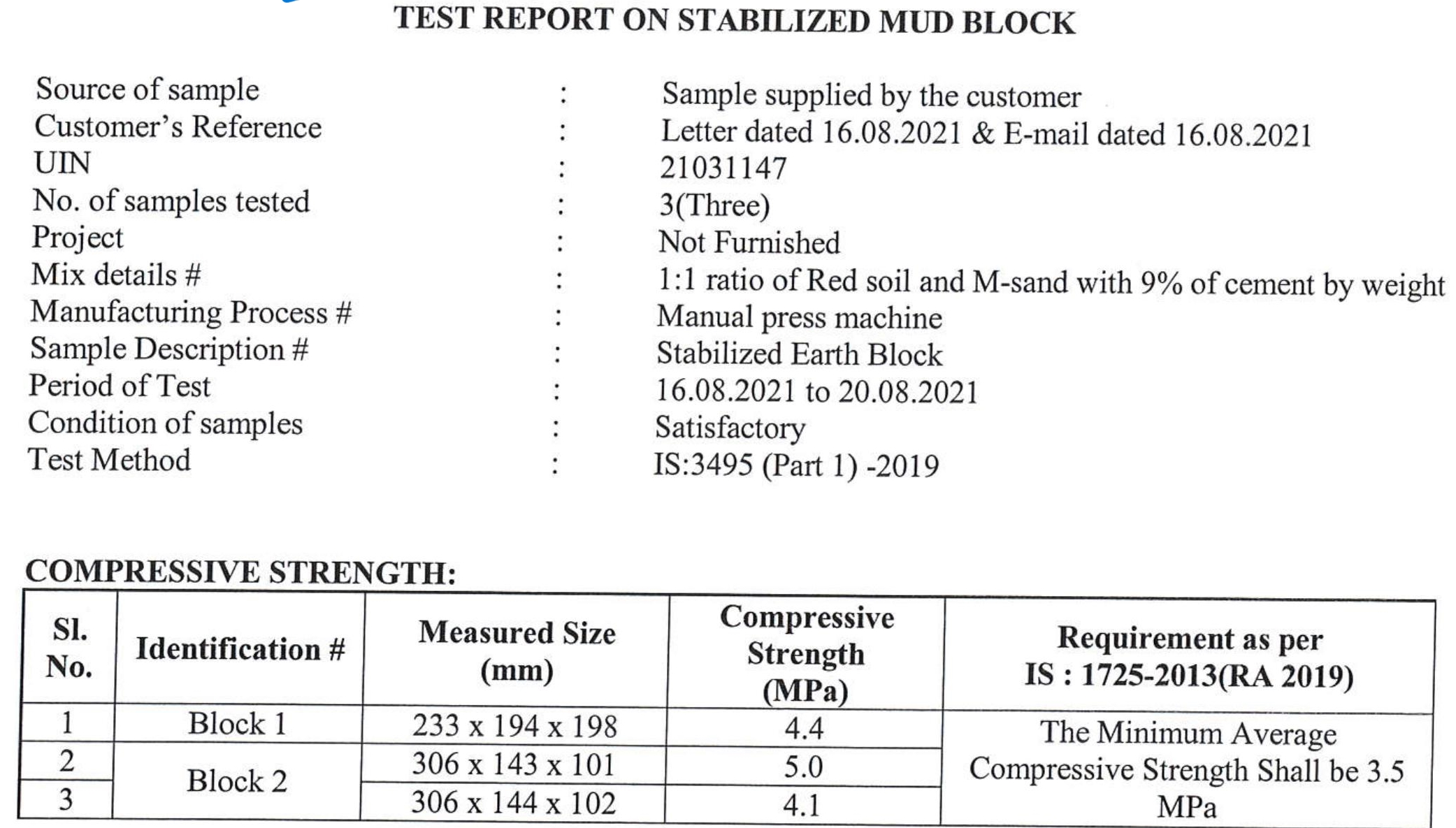 After one week of curing & drying, these CSEB Brick samples were tested for its compression Strength at an authorised Lab as per IS Standards. Results were very much satisfactory and much above the minimum requirements.